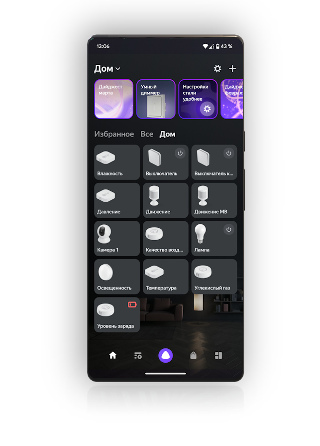 Подсвечивают нижнюю половину устройства с выбором цвета, яркости и насыщенности. Подсветка может использоваться в качестве дополнительного источника освещения, запускаться в сценариях при изменении показаний датчиков